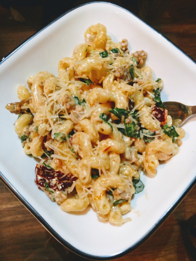 Quick Notes: This easily makes six servings, and doesn’t keep very well – thanks to the butter in the sauce, so adjust as necessary. It’s awesome with spicy sausage as well as normal sausage. I usually try to make this all at once, but you could easily make the noodles and sausage first and set aside if necessary.
