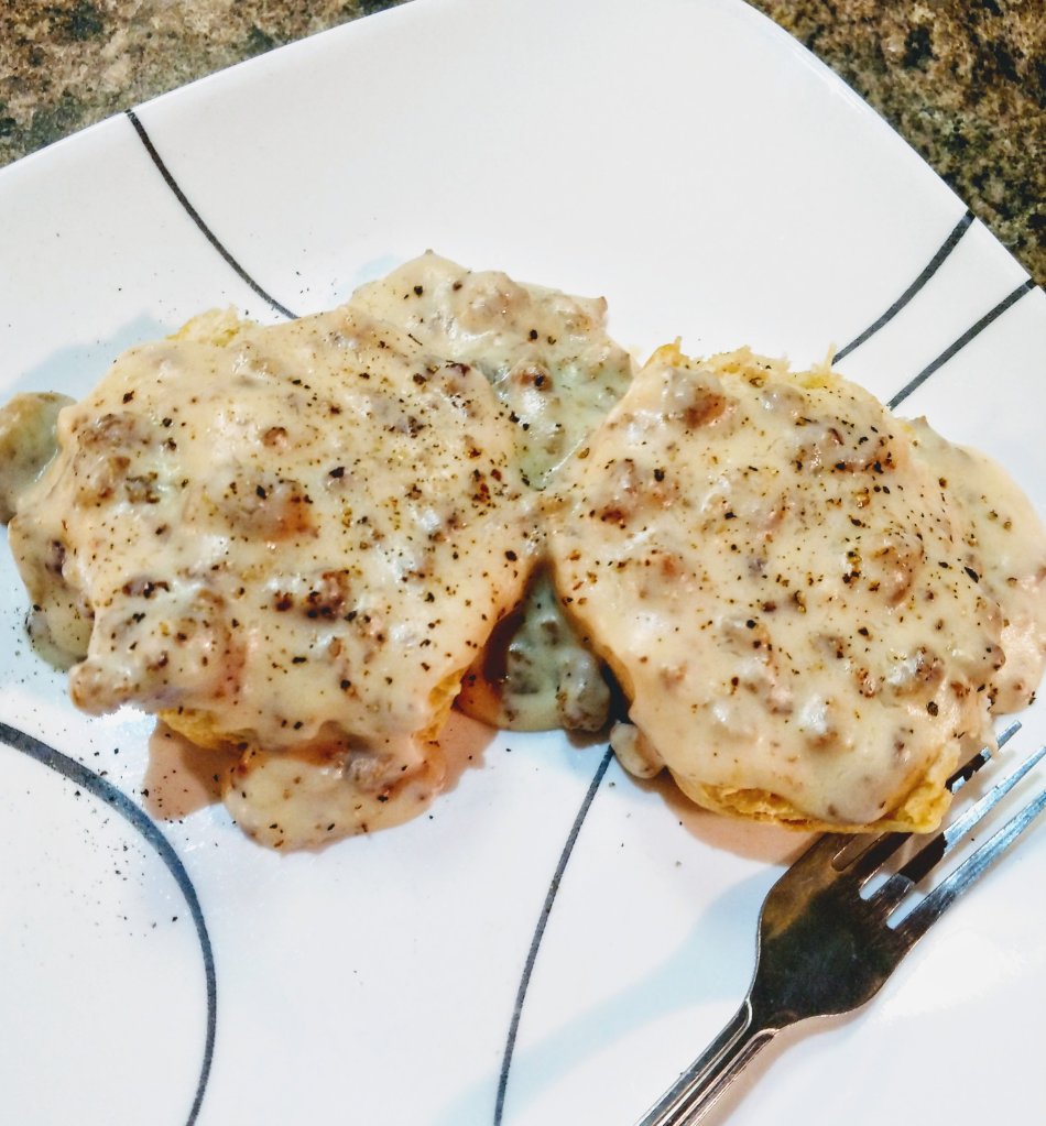 Quick Notes: I’m obviously eating this over biscuits. You can make these from scratch, but honestly… biscuits in a tube are just as good and soooooo much easier. I never bother with scratch biscuits. Also, sometimes making this with spicy sausage is fucking delicious if you’re feeling adventurous.